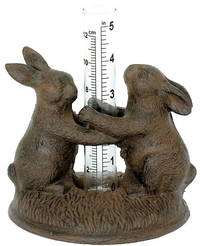 - This sturdy cast iron rain gauge features two rabbits and a glass rain gauge which can collect up to 5 inches of water