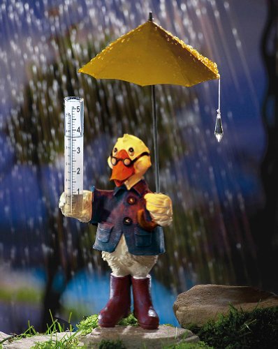 Quacky Duck Rain Gauge: Make rainy days fun as you teach kids about weather science. Station this foul weather fowl in your garden and he ll measure the precipitation in a glass gauge when the skies open up. Solar-powered duck lights up at night and is sculpted of hand-painted polyresin with a metal umbrella. Includes 1 rechargeable AA battery. Measures 7 1/2"L x 6 1/2"W x 19 1/2"H....